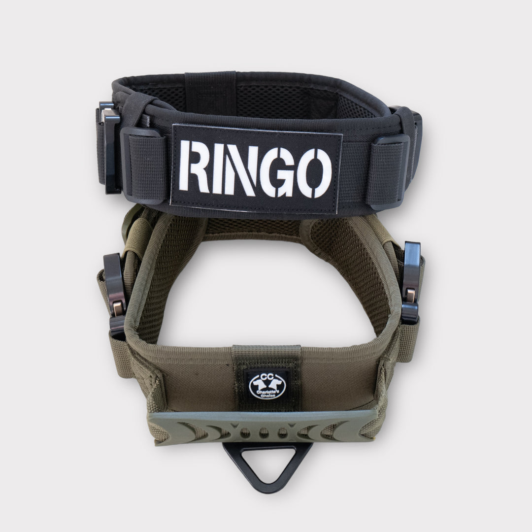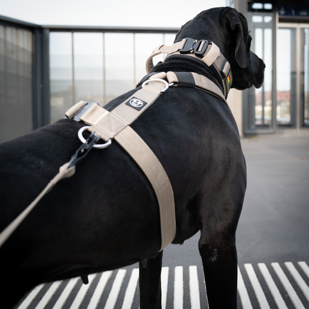 Das Halsband verfügt über den gleichen praktischen Griff, um Ihren Hund kurzführen zu können, und behält das trendige Army-Look-Design bei, das Ihrem vierbeinigen Freund einen stylishen und robusten Look verleiht.