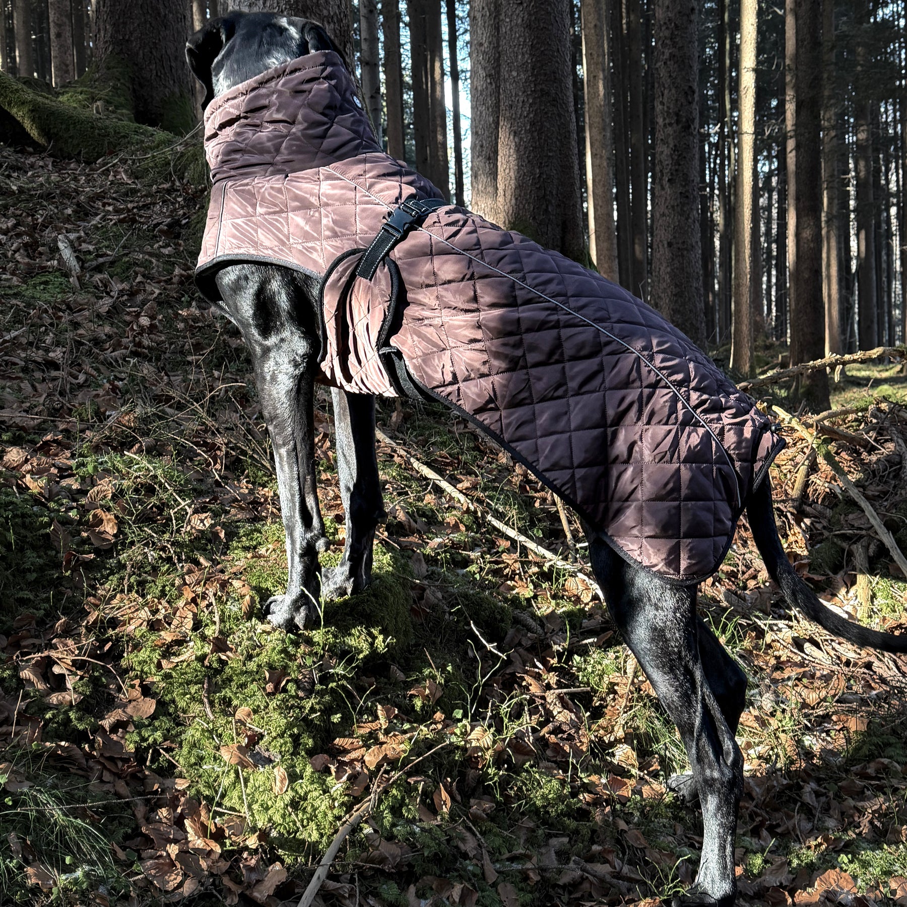 Der Mantel ist eher für schmalere Hunde geschnitten.
